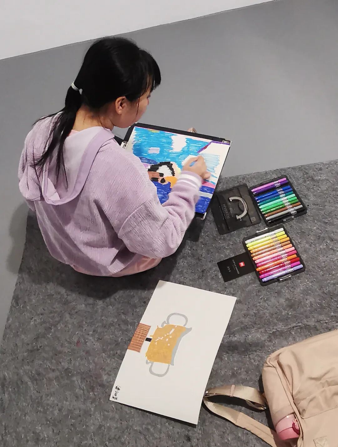 在浙江赛丽美术馆“‘致敬·对话中国’2024年第60届威尼斯双年展官方平行展精品巡回展(杭州)”的展览现场,一群特殊的观众(来自星星的孩子),近距离学习艺术,用画笔临摹画作,展现自己的艺术才华。